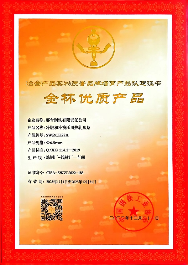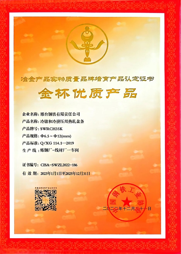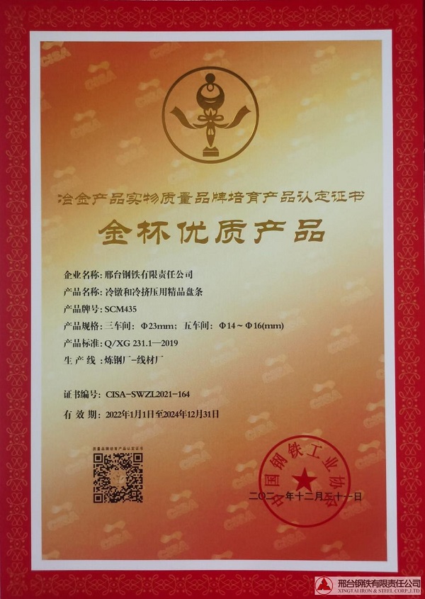 冷鐓和冷擠壓用精品盤條SCM435φ23mm;φ14-φ16mm規(guī)格獲冶金產(chǎn)品實(shí)物質(zhì)量金杯優(yōu)質(zhì)產(chǎn)品認(rèn)定證書