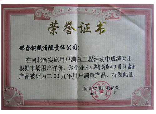 三人牌普通冷加工用LY盤條被評(píng)為2009年河北省用戶滿意產(chǎn)品