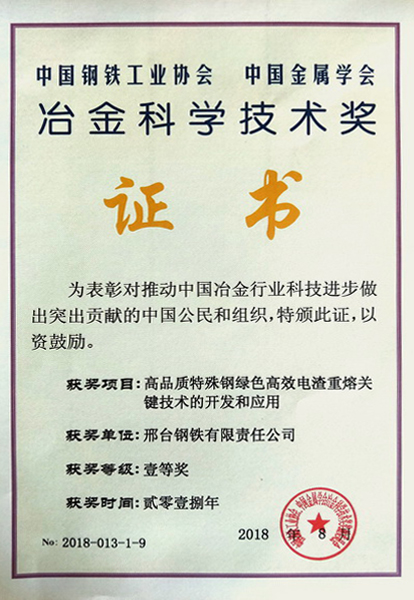 邢鋼高品質(zhì)特殊鋼綠色高效電渣重熔關(guān)鍵技術(shù)喜獲全國冶金科技一等獎(jiǎng)