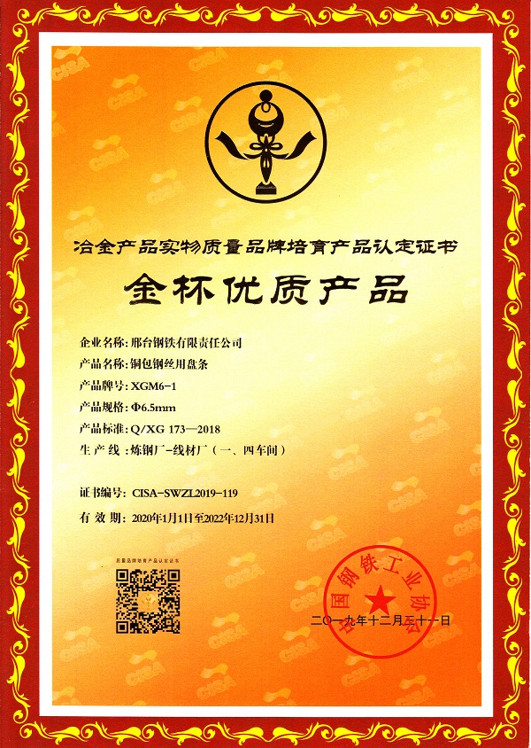 邢鋼銅包鋼絲用盤條XGM6-1 φ6.5mm規(guī)格獲冶金產(chǎn)品實(shí)物質(zhì)量金杯優(yōu)質(zhì)產(chǎn)品認(rèn)定證書