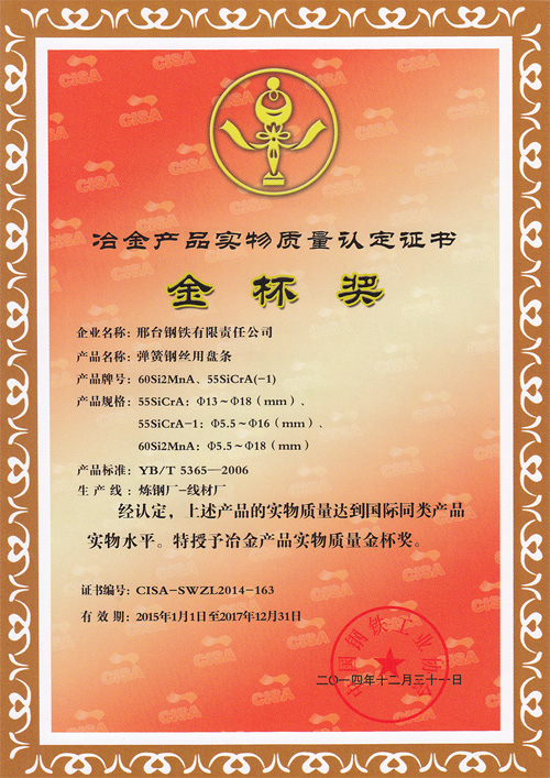 彈簧鋼絲用盤條60Si2MnA、55SiCrA(-1)獲冶金產(chǎn)品實(shí)物質(zhì)量金杯獎