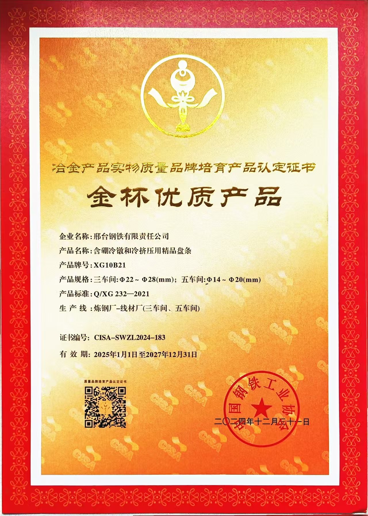 2024年公司含硼冷鐓及冷擠壓用精品盤條XG10B21產(chǎn)品獲得冶金產(chǎn)品實物質量品牌培育產(chǎn)品(金杯優(yōu)質產(chǎn)品)認定證書,簡稱金杯獎。“冶金產(chǎn)品實物質量品牌培育”評選活動于24年3月啟動,由中國鋼鐵工業(yè)協(xié)會主辦,金杯獎是中國鋼鐵工業(yè)協(xié)會組織的冶金行業(yè)唯一的比較權威的獎項,