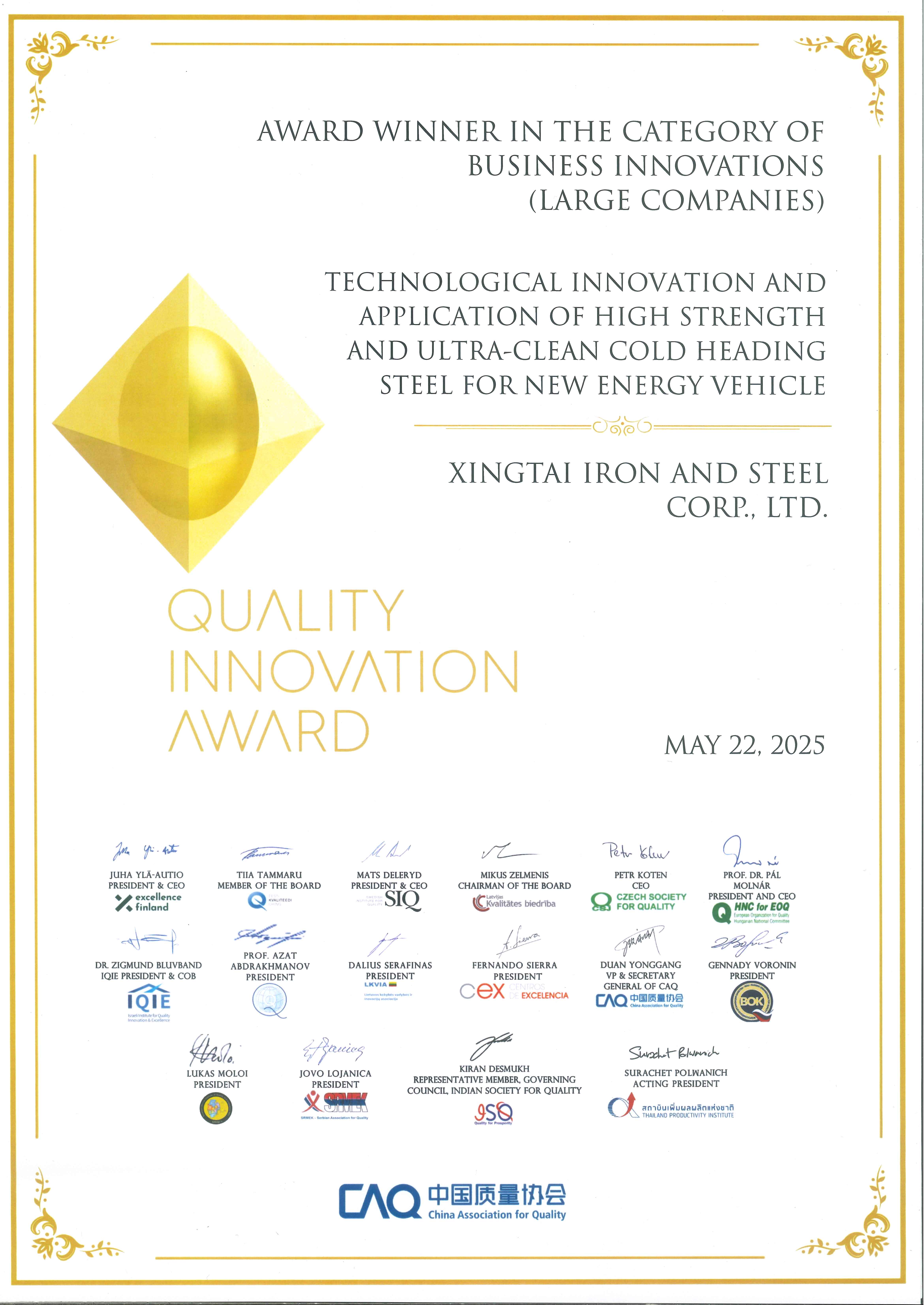 2025.5.22-23邢臺鋼鐵有限責任公司參加了在泰國舉辦的2024年國際質量創(chuàng)新大賽發(fā)布會暨頒獎儀式,邢臺鋼鐵發(fā)布的項目《新能源汽車用高強度超高潔凈度冷鐓鋼技術創(chuàng)新及應用》榮獲該大賽一等獎。這是邢鋼歷史上獲得的首個國際大獎,也是自國際質量創(chuàng)新大賽舉辦以來,在鋼鐵領域首次獲得的國際大獎。