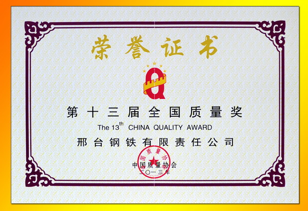 2013年11月3日,由中國(guó)質(zhì)量協(xié)會(huì)組織舉辦的第十三屆全國(guó)追求卓越大會(huì)在北京召開,會(huì)議主題是“科學(xué)發(fā)展——實(shí)現(xiàn)有質(zhì)量的增長(zhǎng)”。大會(huì)隆重舉行了全國(guó)質(zhì)量獎(jiǎng)?lì)C獎(jiǎng)儀式,邢鋼董事長(zhǎng)袁世臻、總經(jīng)理張永藏出席會(huì)議并上臺(tái)領(lǐng)取質(zhì)量管理的最高榮譽(yù)“全國(guó)質(zhì)量獎(jiǎng)”。邢鋼也同時(shí)成為本屆11家全國(guó)質(zhì)量獎(jiǎng)獲獎(jiǎng)組織中唯一一家鋼鐵企業(yè)。