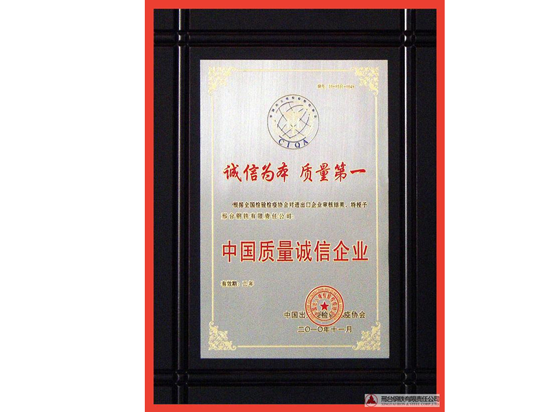2010年11月,中國出入境檢驗檢疫協(xié)會授予邢鋼“中國質(zhì)量誠信企業(yè)”。