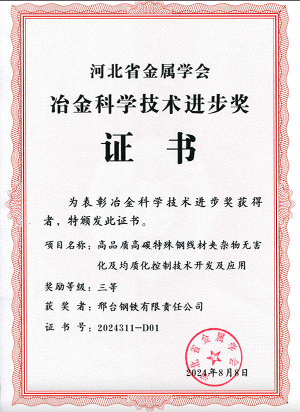 2024年8月8日,《高品質(zhì)高碳特殊鋼線材夾雜物無害化及均質(zhì)化控制技術(shù)開發(fā)及應用》項目榮獲河北省冶金科學技術(shù)進步獎三等獎。