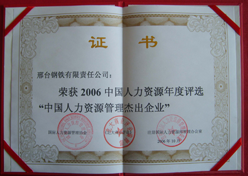 2006年10月,邢鋼榮獲2006中國(guó)人力資源年度評(píng)選“中國(guó)人力資源管理杰出企業(yè)”。