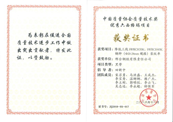 近日獲悉,邢鋼申報的兩個六西格瑪項目,均榮獲了2018年中國質量協(xié)會六西格瑪優(yōu)秀項目獎。獲獎項目分別是煉鋼廠主導的《降低50噸系統(tǒng)鋁脫氧甩廢率》項目和技術中心主導的《降低三線SWRCH35K、SWRCH45K鋼種(Φ20-24mm規(guī)格)裂紋率》項目。