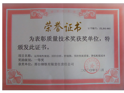 近日獲悉,我公司申報的“運用線性規(guī)劃、回歸分析、控制圖預控焦炭質量,降低配煤成本”質量技術成果,經(jīng)河北省質量技術獎勵委員會評選,獲得一等獎。該項目是焦化廠運用質量統(tǒng)計技術工具經(jīng)過實踐取得的一項質量技術成果。通過實施該項目,配合煤成本比2008年降低了4775萬元,保持了焦炭質量的持續(xù)穩(wěn)定。