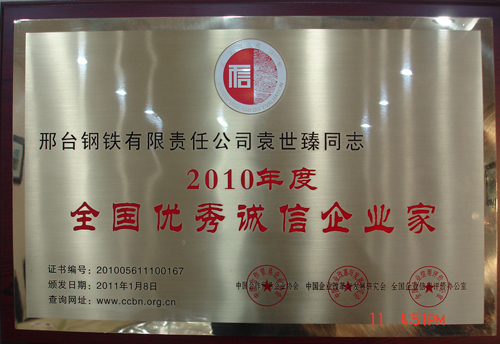 邢鋼榮獲2010年度“全國文明誠信示范單位” 稱號