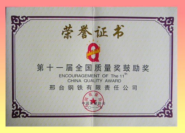 邢鋼榮獲“全國(guó)質(zhì)量獎(jiǎng)鼓勵(lì)獎(jiǎng)”