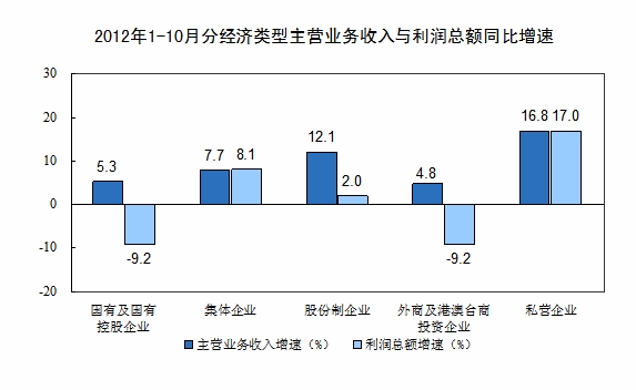 1-10月份,在規(guī)模以上工業(yè)企業(yè)中,國有及國有控股企業(yè)實(shí)現(xiàn)利潤11270億元,同比下降9.2%;集體企業(yè)實(shí)現(xiàn)利潤630億元,同比增長8.1%;股份制企業(yè)實(shí)現(xiàn)利潤23526億元,同比增長2%;外商及港澳臺商投資企業(yè)實(shí)現(xiàn)利潤9195億元,同比下降9.2%;私營企業(yè)實(shí)現(xiàn)利潤12623億元,同比增長17%。