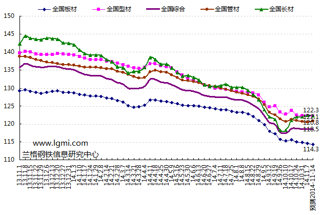 2014年第45周(2014.11.3-11.7)蘭格鋼鐵全國(guó)鋼材綜合價(jià)格指數(shù)達(dá)到118.5點(diǎn),與上周持平,較去年同期下降13.24%。其中,LGMI長(zhǎng)材價(jià)格指數(shù)為122.4點(diǎn),較上周上升0.31%,較去年同期下降15.15%;LGMI型材價(jià)格指數(shù)為122.2點(diǎn),較上周下降0.12%,較去年同期下降12.83%;LGMI板材價(jià)格指數(shù)為114.5點(diǎn),較上周下降0.25%,較去年同期下降11.62%;LGMI管材價(jià)格指數(shù)為120.6點(diǎn),較上周下降0.05%,較去年同期下降13.02%(詳見圖1)。