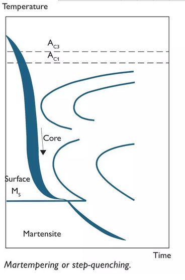 緩慢淬火導(dǎo)致部件的表面和芯之間的較小溫度差,并且不同厚度的部分將具有更均勻的冷卻速率。在低于Ms溫度的馬氏體范圍內(nèi)淬火時(shí),這是非常重要的。