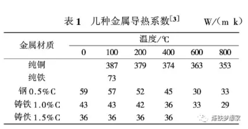 2000年以來銅冷卻壁以其良好的導熱能力和形成渣皮能力在我國高爐上得到廣泛的使用,目前全國約200座以上的高爐采用銅冷卻壁,尤其是在爐腹、爐腰和爐身下部等熱負荷較高的區(qū)域。高爐冷卻壁主要包括鑄鐵和純銅,另外還出現(xiàn)過鑄鋼冷卻壁。鑄鐵冷卻壁抗熱震性能差、導熱系數(shù)低。另外,其冷卻水管是鑄入鑄鐵本體內(nèi)的,由于材質(zhì)和膨脹系數(shù)的不同,形成氣隙層,而影響了傳熱。這些缺陷限制了鑄鐵冷卻壁的進一步發(fā)展。因此,從上世紀70年代歐洲開發(fā)和使用了銅冷卻壁,得到較好的效果。表1為幾種不同金屬導熱系數(shù),可以看出純銅的導熱系數(shù)遠優(yōu)于其他材料。