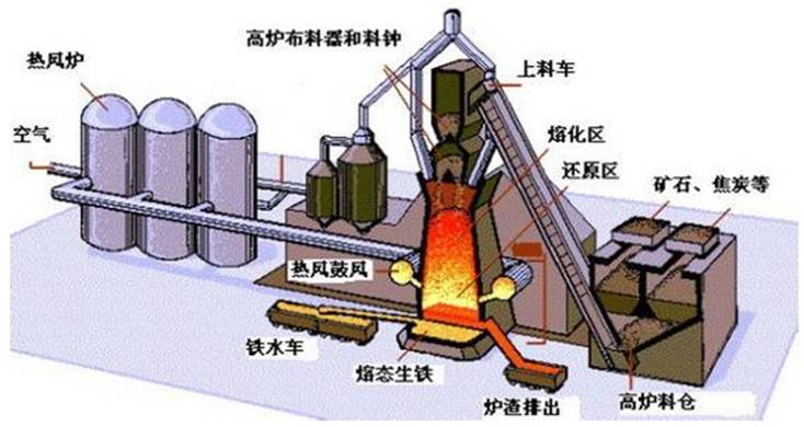 高爐生產過程就是將鐵礦石在高溫下冶煉成生鐵的過程。從爐頂裝入鐵礦石、焦炭、造渣用熔劑(石灰石),從位于爐子下部沿爐周的風口吹入預熱的空氣。在高溫下,焦炭中的碳(有的高爐也噴吹煤粉、重油、天然氣等輔助燃料)同鼓入空氣中的氧發(fā)生燃燒反應,產生高溫和還原性氣體,這些還原性氣體在上升過程中加熱緩慢下行的爐料,并將鐵礦石中的鐵氧化物還原成金屬鐵。