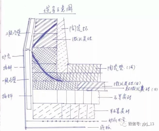 (4)炭磚與冷卻壁間為碳素?fù)v料,60mm;