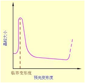 (2)預(yù)先變形度 變形度的影響主要與金屬變形的均勻度有關(guān)。變形越不均勻, 再結(jié)晶退火后的晶粒越大。變形度很小時(shí),因不足以引起再結(jié)晶,晶粒不變。當(dāng)變形度達(dá)到2~10%時(shí),金屬中少數(shù)晶粒變形,變形分布很不均勻,所以再結(jié)晶時(shí)生成的晶核少,晶粒大小相差極大,非常有利于晶粒發(fā)生吞并過(guò)程而很快長(zhǎng)大,結(jié)果得到極粗大的晶粒。使晶粒發(fā)生異常長(zhǎng)大的變形度稱(chēng)作臨界變形度。生產(chǎn)上應(yīng)盡量避免在臨界變形度范圍內(nèi)的塑性變形加工。超過(guò)臨界變形度之后,隨變形度的增大,晶粒的變形更加強(qiáng)烈和均勻,再結(jié)晶核心越來(lái)越多,因此再結(jié)晶后的晶粒越來(lái)越細(xì)小。但是當(dāng)變形度過(guò)大(約≥90%)時(shí), 晶??赡茉俅纬霈F(xiàn)異常長(zhǎng)大,一般認(rèn)為它是由形變織構(gòu)造成的。