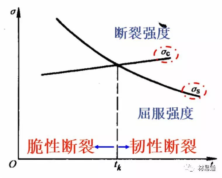 低溫脆性是材料屈服強(qiáng)度隨著溫度的降低急劇增加的結(jié)果;見右圖,屈服點(diǎn)隨著溫度的下降而升高,但材料的斷裂強(qiáng)度隨著溫度的變化很??;兩線交點(diǎn)對應(yīng)的溫度就是tk。