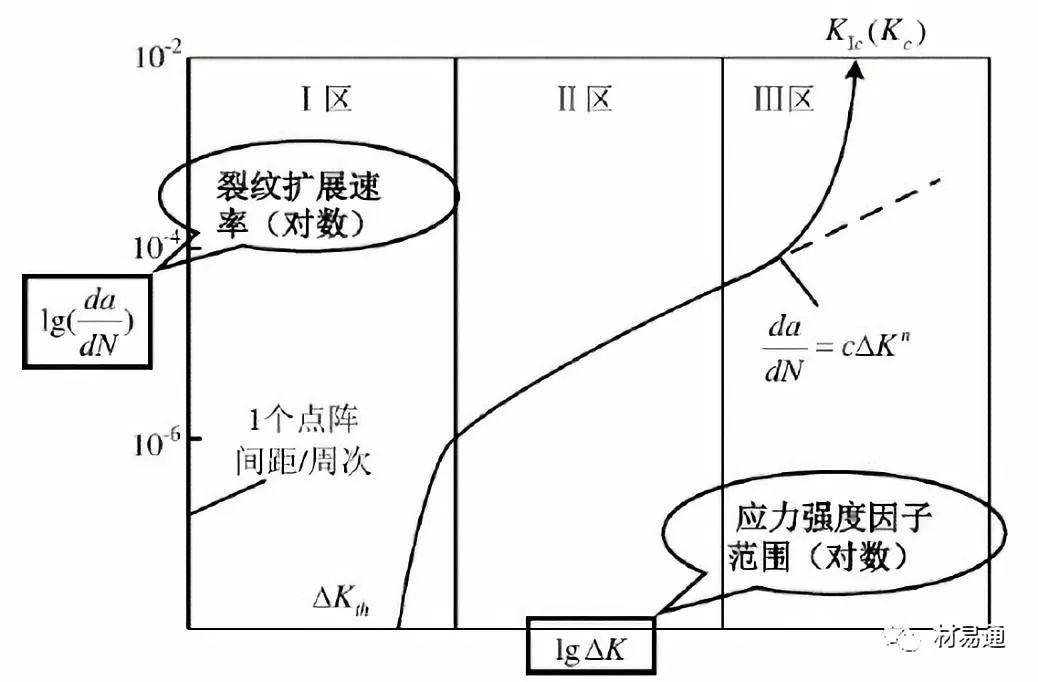 II區(qū):裂紋擴展主要階段,10-5~10-2mm/周次,da/dN~△K呈冪函數(shù)關系,△K變化范圍很大,擴展壽命長。