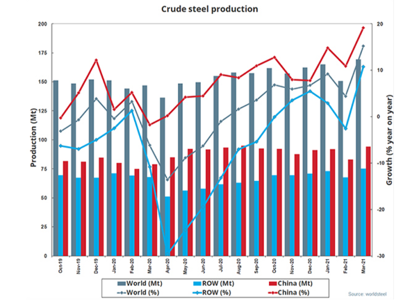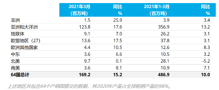 2021年3月全球64個(gè)納入世界鋼鐵協(xié)會(huì)統(tǒng)計(jì)國(guó)家的粗鋼產(chǎn)量為1.692億噸,同比提高15.2%。