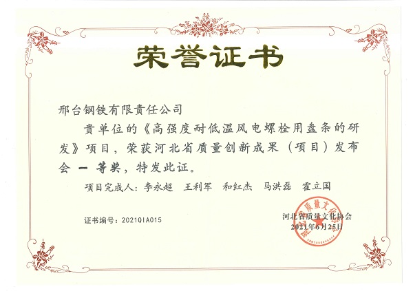 近日,由河北省質(zhì)量文化協(xié)會主辦的“河北省第四屆質(zhì)量創(chuàng)新成果(項(xiàng)目)發(fā)布會”在秦皇島召開,邢鋼精益六西格瑪代表團(tuán)3個成果入圍發(fā)布會名單,其中《高強(qiáng)度耐低溫風(fēng)電螺栓用盤條的研發(fā)》和《提高不銹鋼1Cr13澆次連澆爐數(shù)》榮獲一等獎,《提高Q55SiCrA-1線材成材率》榮獲二等獎。