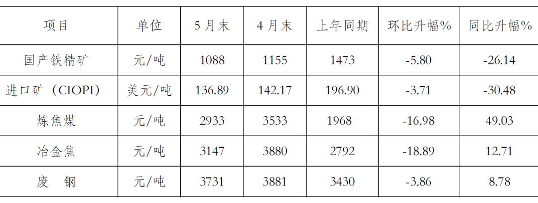 5月末,CIOPI進(jìn)口礦價(jià)格環(huán)比下降5.28美元/噸,國(guó)產(chǎn)鐵精礦價(jià)格環(huán)比下降67元/噸;煉焦煤價(jià)格環(huán)比下降600元/噸,冶金焦價(jià)格環(huán)比下降733元/噸,廢鋼價(jià)格環(huán)比下降150元/噸。原燃料價(jià)格雖環(huán)比回落,但總體仍處于高位。(見(jiàn)下表)
