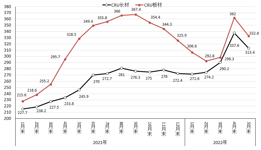 5月份,CRU國(guó)際鋼材價(jià)格指數(shù)為332.9點(diǎn),環(huán)比下降21.0點(diǎn),降幅為5.9%;同比上升31.8點(diǎn),升幅為10.6%。(見(jiàn)下圖)