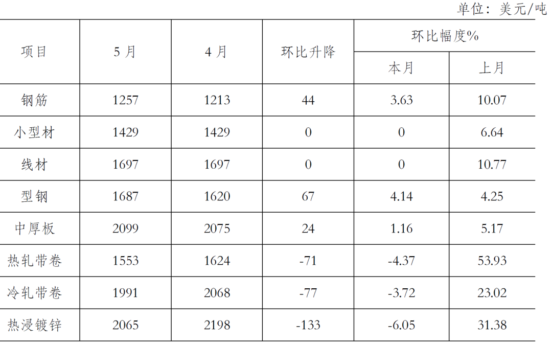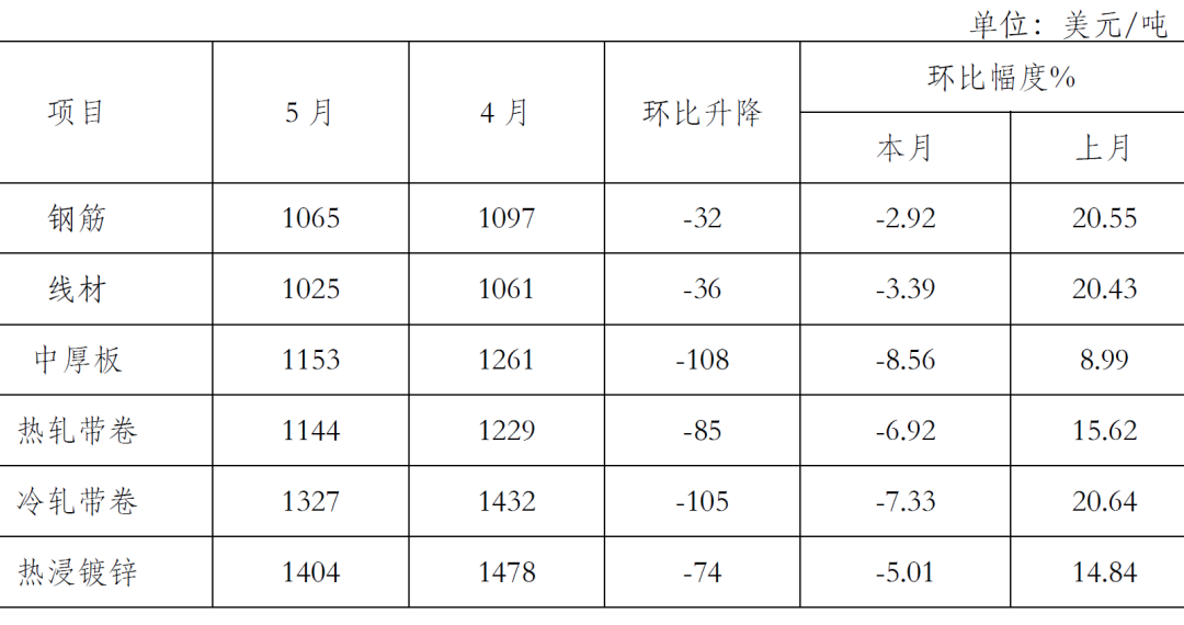 5月末,鋼鐵協(xié)會(huì)監(jiān)測(cè)的八大鋼材品種價(jià)格均有所下降。其中,熱軋卷板和冷軋薄板繼續(xù)下降,且降幅較上月有所加大,環(huán)比分別下降302元/噸和196元/噸;高線、三級(jí)鋼筋、角鋼、中厚板、鍍鋅板和熱軋無(wú)縫管價(jià)格由升轉(zhuǎn)降,環(huán)比分別下降272元/噸、298元/噸、188元/噸、154元/噸、162元/噸和91元/噸。(見(jiàn)下表)