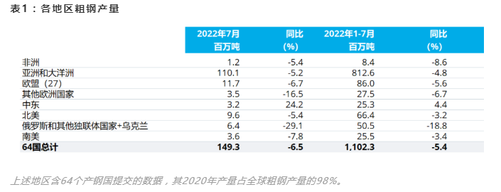 2022年7月全球64個(gè)納入世界鋼鐵協(xié)會統(tǒng)計(jì)國家的粗鋼產(chǎn)量為1.493億噸,同比下降6.5%。
