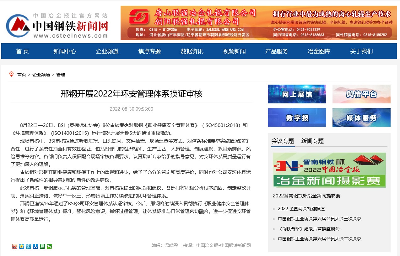 8月22日—26日,BSI(英標(biāo)標(biāo)準(zhǔn)協(xié)會(huì))8位審核專家對(duì)邢鋼《職業(yè)健康安全管理體系》(ISO45001:2018)和《環(huán)境管理體系》(ISO14001:2015)運(yùn)行情況開(kāi)展為期5天的換證審核活動(dòng)。