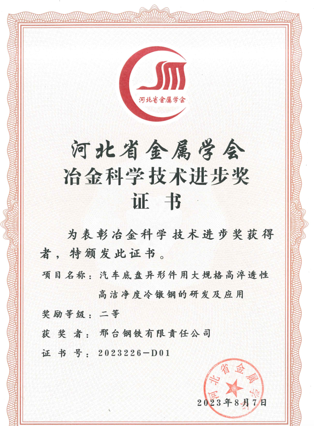 近日,邢臺鋼鐵有限責(zé)任公司兩項(xiàng)科技研發(fā)項(xiàng)目“高性能緊固件用鋼的研發(fā)及產(chǎn)業(yè)化應(yīng)用項(xiàng)目”“汽車底盤異形件用大規(guī)格高淬透性高潔凈度冷鐓鋼的研發(fā)及應(yīng)用”得到河北省金屬學(xué)會專家評審委員會的高度認(rèn)可,分別榮獲2023年度的 “河北冶金科學(xué)技術(shù)獎”一、二等獎。