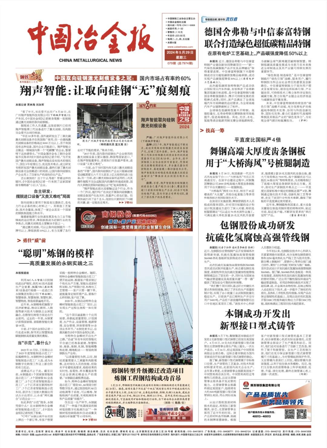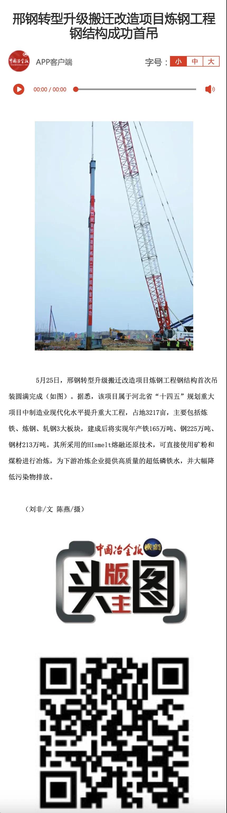 【媒體報道】中國冶金報“頭版主圖”報道邢鋼轉(zhuǎn)型升級項目進展