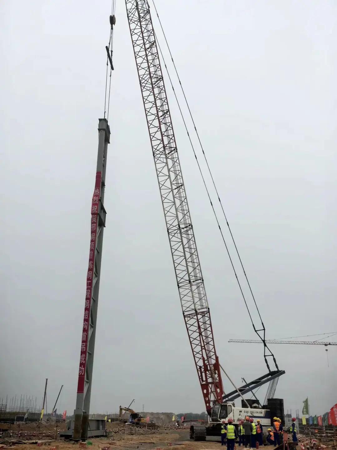 Amid an atmosphere of high spirits and thunderous applause at the construction site, Chairman Zhang Yuming issued the order to commence the hoisting operation. Under the watchful eyes of Vice Presidents Ma Baoliang and Han Qinglian, along with 450 workers from eight construction teams, a towering crane lifted the 30.6-meter steel structure into place, smoothly lowering it into the foundation socket.