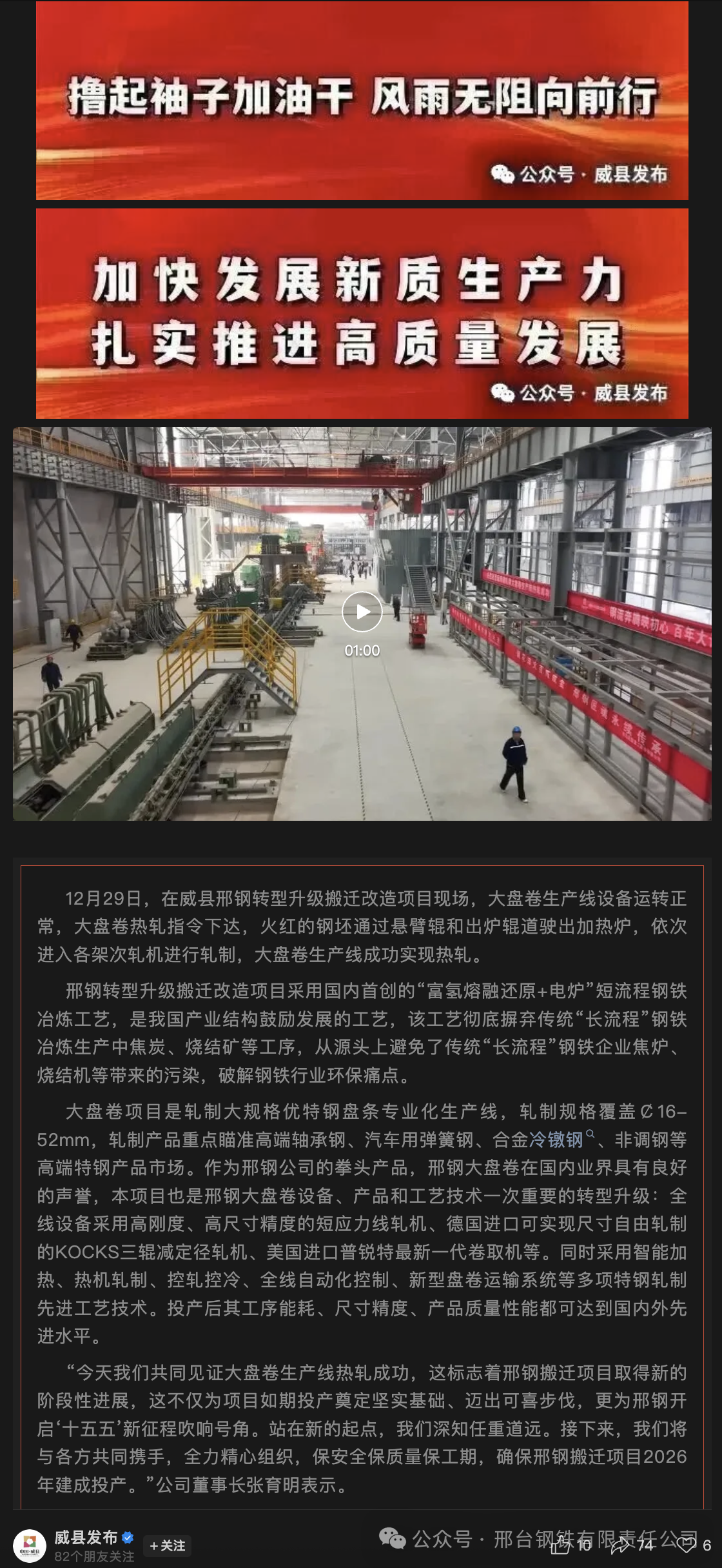 “今天我們共同見證大盤卷生產(chǎn)線熱軋成功,這標(biāo)志著邢鋼搬遷項(xiàng)目取得新的階段性進(jìn)展,這不僅為項(xiàng)目如期投產(chǎn)奠定堅(jiān)實(shí)基礎(chǔ)、邁出可喜步伐,更為邢鋼開啟‘十五五’新征程吹響號角。站在新的起點(diǎn),我們深知任重道遠(yuǎn)。接下來,我們將與各方共同攜手,全力精心組織,保安全保質(zhì)量保工期,確保邢鋼搬遷項(xiàng)目2026年建成投產(chǎn)。”公司董事長張育明表示。